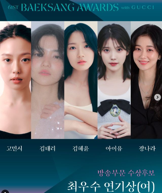 작품 주연상 여자 후보는 넷플릭스 '아무도없는 숲속에서' 고민시, tvN '정년이' 김태리, tvN '선재업고 튀어' 김혜윤, 넷플릭스 '폭싹 속았수다' 아이유, SBS '굿파트너' 장나라다.