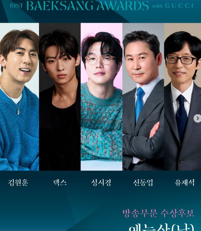 남자 예능상도 마찬가지다. '숏박스', 'SNL 코리아'에서 활약하고 있는 김원훈, 웹예능 냉터뷰 등 각종 방송에 출연중인 덱스, 자신의 유튜브 채널에서 먹방과 토크를 이어가고 있는 성시경, '짠한형 신동엽'의 신동엽, 각종 지상파 방송에 더해 '핑계고'의 진행을 맡고있는 유재석까지. 유튜브에서 자주 보이는 이들이 모두 후보다.