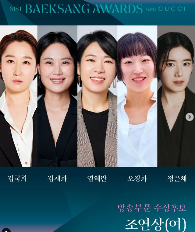작품 조연상 여자 후보로는 쿠팡플레이 '가족계획' 김국희, JTBC '옥씨부인전' 김재화, 넷플릭스 '폭싹 속았수다' 염혜란, tvN '정년이' 오경화, 정은채다.