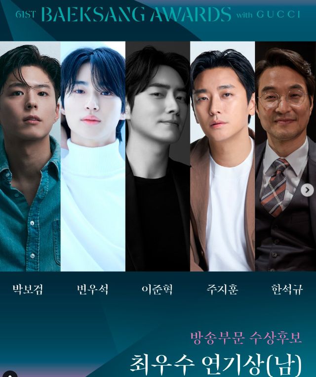 작품 주연상 남자 후보로는 넷플릭스 '폭싹 속았수다' 박보검, tvN '선재업고 튀어' 변우석, 티빙 '좋거나 나쁜 동재' 이준혁, 넷플릭스 '중증외상센터' 주지훈, MBC '이토록 친밀한 배신자' 한석규다.