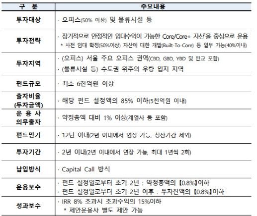 펀드 규모는 최소 6000억원 이상이며 이 중 우본 출자비율은 펀드 설정액의 85% 이하(5000억원 이내)다. 투자대상은 ‘오피스 및 물류시설 등’(코어 및 코어플러스 자산)이며, 오피스 비중이 50%가 넘는다.