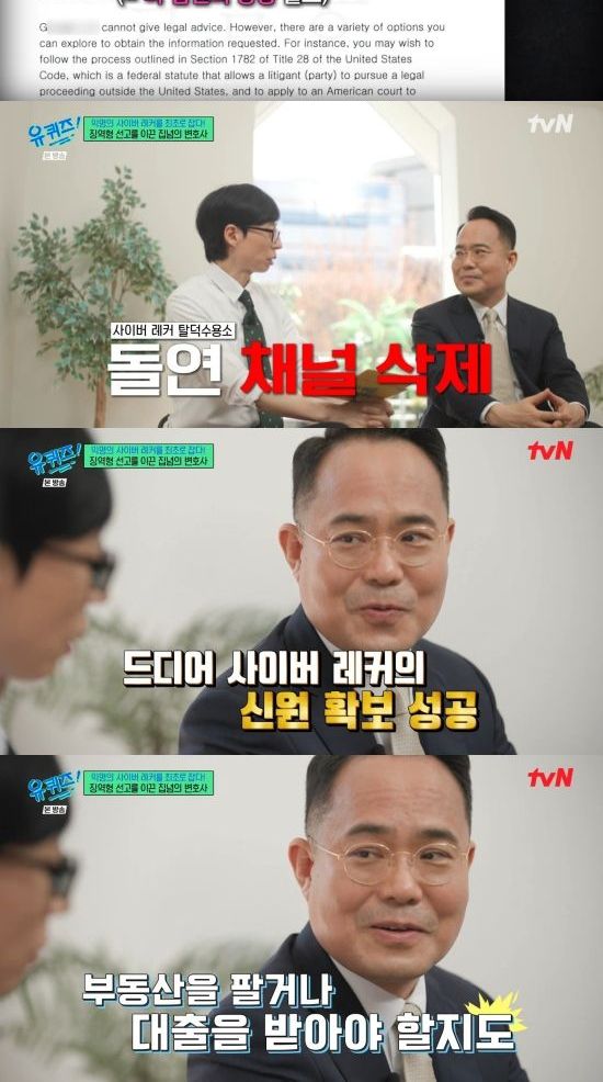 9일 방송된 tvN '유 퀴즈 온 더 블럭'(이하 '유퀴즈')에서는 '필사의 사투' 특집으로 꾸며진 가운데 정경석 변호사가 사이버 레카 탈덕수용소 운영자를 상대로 소송을 진행한 사연을 밝힌 장면이 전파를 탔다.