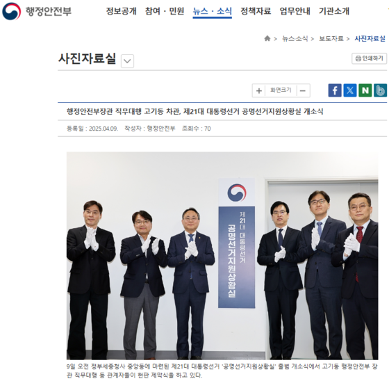 행정안전부는 오는 6월 3일 실시하는 제21대 대통령선거가 공정하고 깨끗하게 치뤄질 수 있도록 지원하기 위해 '공명선거지원상황실(이하 '상황실')'을 9일 개소했다고 밝혔다.