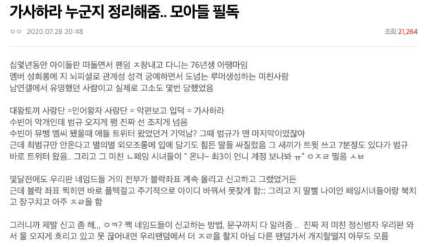 운영자인 박주아는 수십 명의 연예인을 비방하고 명예를 훼손한 혐의로 고소당해 최근 법정에 섰으며, 그간 철저히 감춰왔던 신상과 정체가 드러나며 대중의 관심과 비난을 한 몸에 받고 있다.