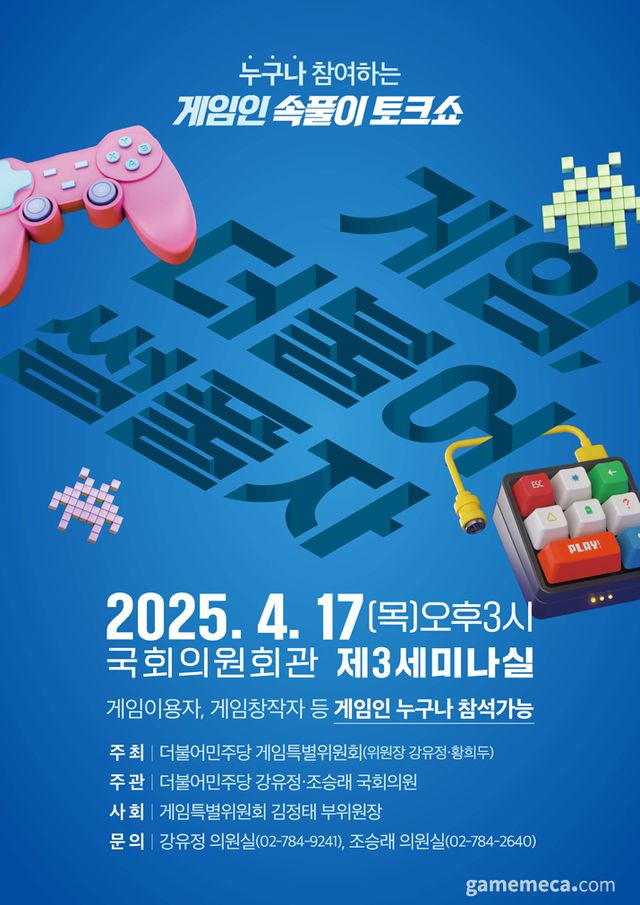 더불어민주당 게임특별위원회(이하 게임특위)는 오는 17일 오후 3시 국회의원회관 제3세미나실에서 게임을 사랑하는 국민 누구나 참여 가능한 [게임인 속풀이토크쇼 '게임, 더불어썰풀자' 소통간담회]를 개최한다.