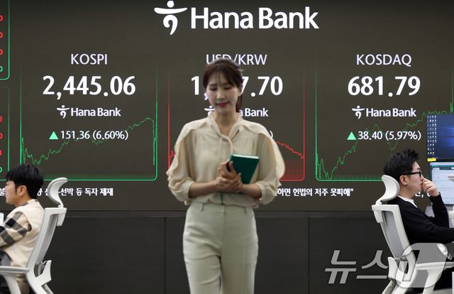 널드 트럼프 미국 대통령의 상호관세 유예 발표로 주가가 급등하며 매수 사이드카가 발동된 10일 오후 서울 중구 하나은행 본점 딜링룸 전광판에 종가가 표시되고 있다. 이날 코스피 지수는 전 거래일 대비 6.60% 오른 2,445.06, 코스닥 지수는 5.97% 오른 681.79로 장을 마쳤다. 코스피와 코스닥에서 같은 날 매수 사이드카가 발동한 것은 지난해 8월 6일 이후 8개월 여 만이다. 2025.4.10/뉴스1