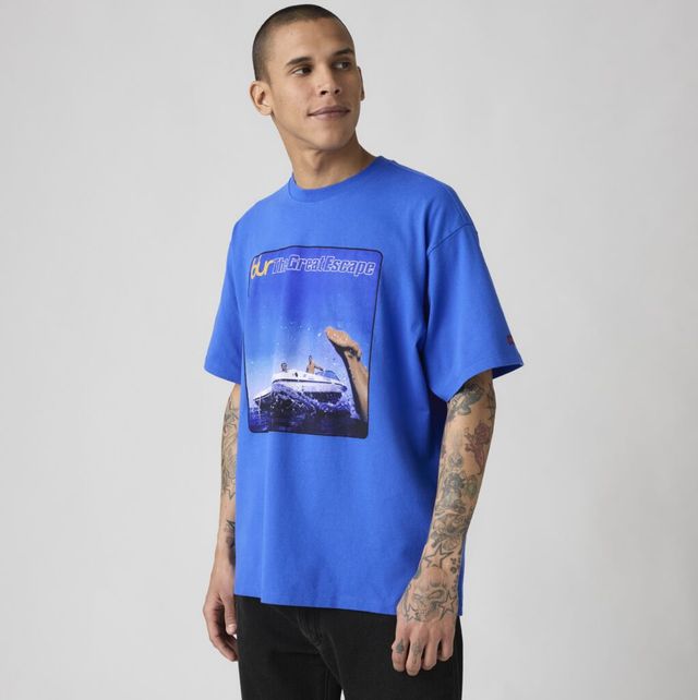 이번 컬렉션은 블러의 음악적 여정을 시각적으로 풀어낸 티셔츠 3종으로 구성됐습니다. 이들이 세계 음악씬에서 본격적으로 존재감을 드러냈던 90년대 전성기를 연상시키는 클래식한 시그니처 심볼과 앨범 아트워크를 모티프로 활용했습니다. 블랙과 화이트 티셔츠에는 각각 블루와 레드 컬러의 블러 로고를 삽입했습니다. 블러를 대표하는 앨범, ‘The Great Escape’의 30주년을 기념하는 앨범 아트워크는 블루 티셔츠에 프린트했죠. 아울러 모든 티셔츠의 라벨에는 90년대 직조 라벨에서 영감받은 디자인을 적용해 당시의 시대상까지 섬세하게 구현했습니다.