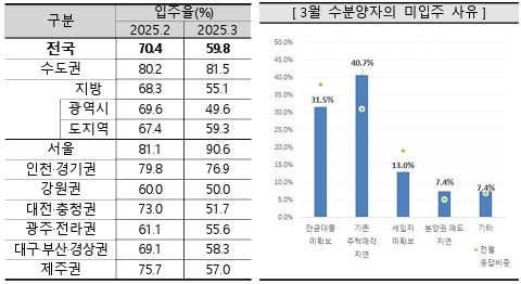 수도권 입주율은 3개월 연속 상승세(1월 74.1%→2월 80.2%→3월 81.5%)를 보이고 있으나, 비수도권은 55.1%로 조사 이래 역대 최저 입주율을 기록했다. 수도권과 비수도권의 입주율차도 26.4%p로 조사 이래 가장 높았다. 특히 서울 9.5%p(81.1%→90.6%) 상승을 제외하고 대전·충청권(73.0%→51.7%), 제주권(75.7%→57.0%), 대구·부산·경상권(69.1%→58.3%) 등 모든 권역에서 입주율이 하락했다.