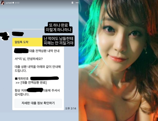 서유리는 10일 자신의 SNS를 통해 "또 하나 완료. 이렇게 하나하나"라는 글과 함께 ‘대출 전액상환 내역 안내’ 문자 캡처 사진을 공개했다.