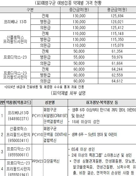 2024년 비급여 가격 조사·분석 결과, 폐렴구균 예방접종은 약제 종류에 따라 평균 가격에 상당한 차이가 있었다.