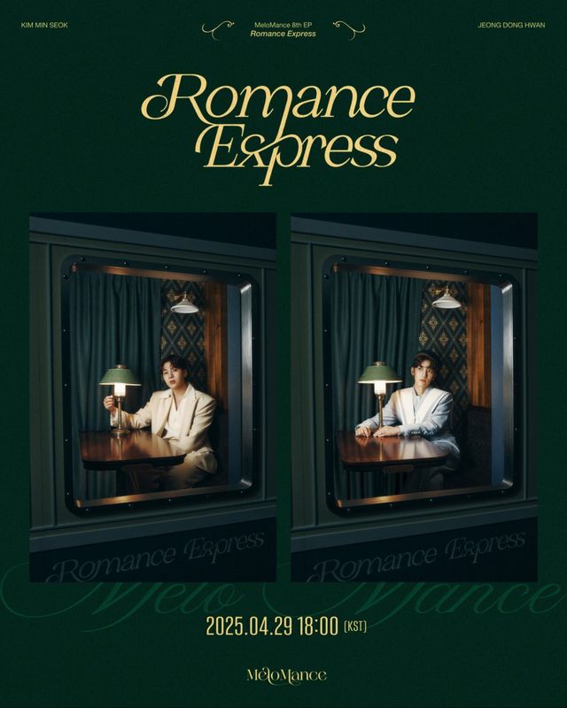 공개된 이미지에는 객차 창문을 통해 비치는 김민석, 정동환 두 멤버의 모습이 담겼다. 두 사람은 각각 베이지와 그레이 톤의 밝은 수트를 착용해 포멀한 매력을 자아냈다. 짙은 초록색을 메인으로 한 클래식한 열차 내부는 엔틱한 조명, 커튼 장식과 어우러져 우아한 분위기를 더했다. 이와 함께 새 미니앨범의 타이틀인 ‘Romance Express’와 발매일시가 함께 공개돼 기대감을 끌어올렸다.