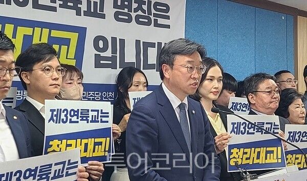 [투어코리아=이창호 기자] 더불어민주당 이용우 의원이 11일 오후 인천시청 브리핑룸에서 기자회견을 열고 오는 12월 준공을 앞둔 제3연륙교의 명칭을 ‘청라대교’로 조속히 결정하기를 인천시에 촉구하고 있다. 2025.04.11. 투어코리아 이창호 기자