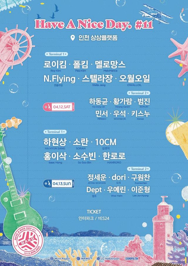 한편, ‘해브어나이스데이’는 오는 4월 12일, 13일 양일간 인천 상상플랫폼에서 개최될 예정이었다. 첫날인 4월 12일엔 ‘로이킴’을 필두로 ‘폴킴’, ‘멜로망스’, ‘N.Flying(엔플라잉)’, ‘스텔라장’, ‘오월오일’이 ‘Terminal 1(터미널 1)’ 무대에 오르고 또 다른 스테이지인 ‘Terminal 2(터미널 2)’에서는 ‘하동균’을 비롯해 ‘황가람’, ‘범진’, ‘민서’, ‘우석’, ‘키스누’가 출연할 예정이었다. 둘째날인 4월 13일, “Terminal 1(터미널 1)’에는 ‘하현상’, ‘소란’, ‘10CM’, ‘홍이삭’, ‘소수빈’, ‘한로로’가 출격하고 ‘Terminal 2(터미널 2)’는 ‘정세운’을 중심으로 ‘dori(도리)’, ‘구원찬’, ‘Dept(뎁트)’, ‘우예린’, ‘이준형’이 출연을 확정한 상황이었다.
