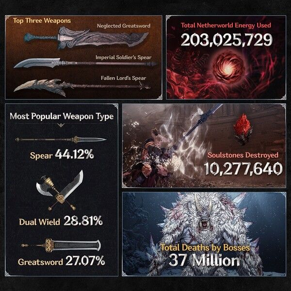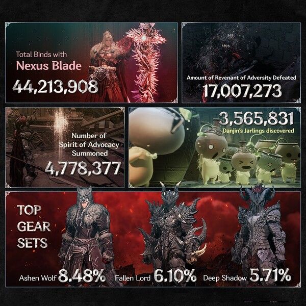 이외에도 레벨업과 거점 귀환 등에 쓰이는 ‘귀검’ 사용 횟수는 약 4,400만 회에 달했으며, 게임 내 수집 요소인 ‘항아리 정령’ 발견 횟수는 약 350만 회에 달했다. 방어구 장비 세트 가운데에서는 게임 초반부터 수집 가능한 ‘잿빛 늑대’ 세트가 8.48% 비율로 인기 1위를 달렸다. 1위의 비중이 낮은 편인 점은 게임 속 수많은 방어구 세트가 적절한 밸런스를 이뤘다는 것으로 풀이된다.