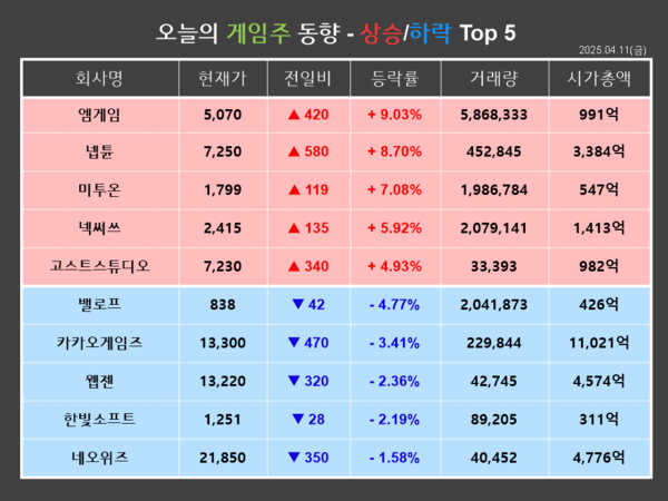 엠게임이 금일(11일) 전거래일 대비 9.03%(420원) 상승한 5,070원에 거래를 마쳤다. 개인이 91,572주를 순매수한 반면, 기관과 외국인이 각각 752주, 73,021주를 순매도하며 장 초반부터 반등해 상승장으로 마감했다.