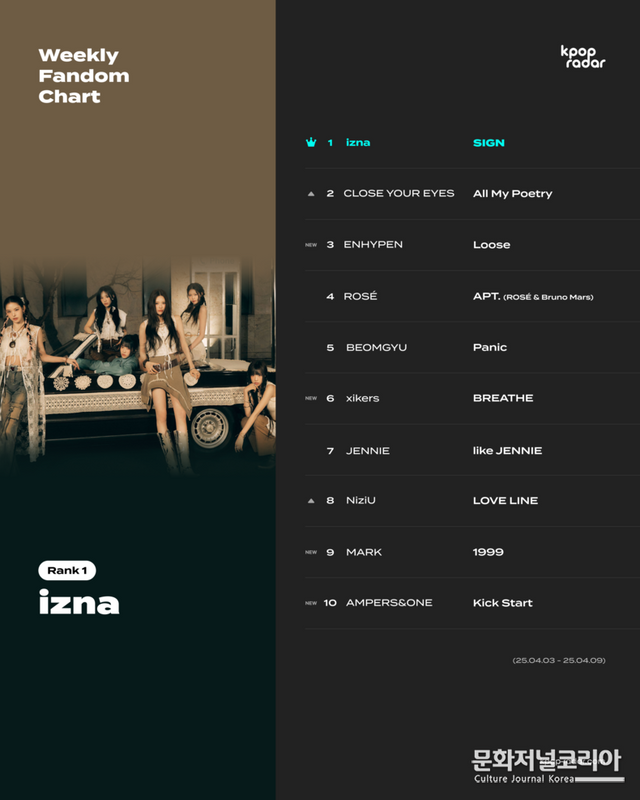 ‘케이팝레이더’의 위클리 팬덤 차트는 아티스트들의 성장 지표를 분석해 매주 발표되며, 이즈나는 11일 집계된 차트에서 신곡 ‘사인(SIGN)’으로 정상을 차지했다.