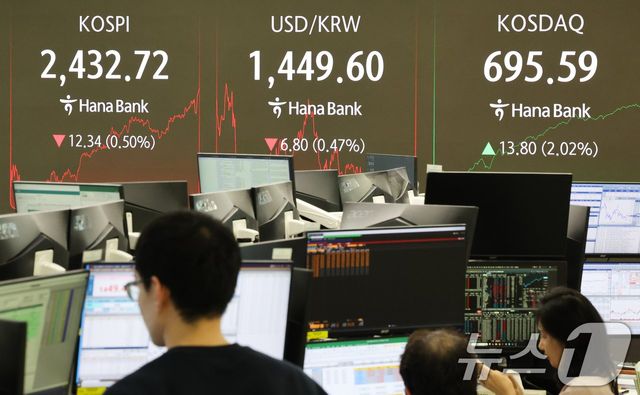11일 서울 중구 하나은행 본점 딜링룸 전광판에 코스피지수가 전 거래일(2445.06)보다 12.34포인트(0.50%) 하락한 2432.72을 나타내고 있다. 코스닥는 전 거래일(681.79)보다 13.80포인트(2.02%) 오른 695.59로 원/달러 환율은 전 거래일(1456.4원)보다 6.5원 내린 1449.9원에 거래를 마쳤다. 2025.4.11/뉴스1