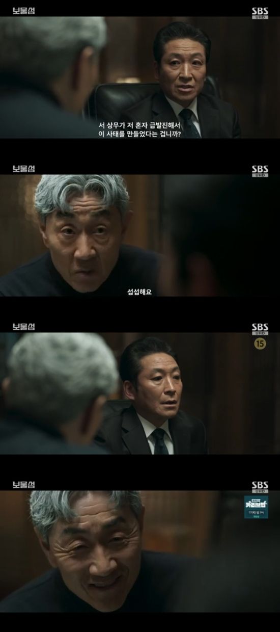 11일 방송된 SBS 금토드라마 '보물섬' 15회에서는 서동주(박형식 분)로 인해 악행이 생중계 된 염장선(허준호)가 어르신(최광일)과 만나는 모습이 그려졌다.