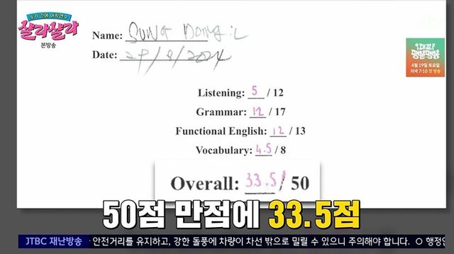이윽고 다가온 결전의 시간. 듣기 평가, 문법 등 기말고사 시험지가 공개됐다. 영어 트라우마가 있는 김광규는 스피킹 테스트를 앞두고 긴장했지만, 배운 걸 적용하려고 노력했다. 초급반 성동일의 기말고사 성적은 50점 만점에 33.5점. 사전 테스트에서 8점을 받으며 꼴찌를 했던 성동일은 일취월장한 실력으로 눈길을 끌었다. 사전 테스트에서 22점을 받았던 김광규는 이번에도 듣기평가에서 찍기에 성공, 31점을 획득했다. 중급반 결과도 나왔다. 신승환은 62.5점, 엄기준은 72점을 받은 가운데, 장혁은 91점으로 최고점을 받았다.