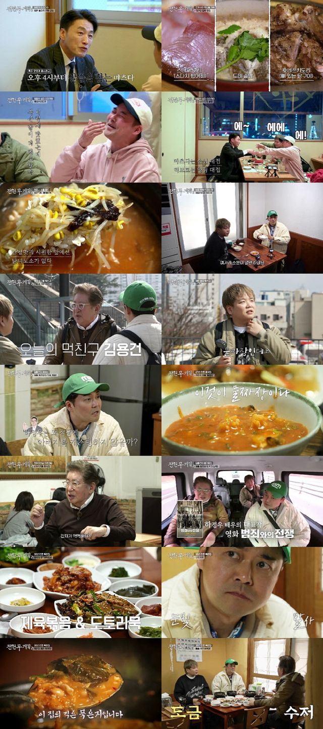 ‘전주 명물’ 물짜장을 맛본 뒤에는 “전라도에 왔으니 백반 한 차림 먹어야지!”라며 모두 차에 올랐다. 이동하던 중, 김용건은 “하정우의 연기를 어떻게 생각하냐”는 질문에 “항상 뭔가 불안하다“며 “‘범죄와의 전쟁’ 때도 조진웅의 사투리가 똑 부러지고 하정우는 어설프더라”고 송곳 평을 내놨다. 그러면서도 그는 “하정우는 ‘1947 보스톤’ 때부터 달라졌다. 좋더라. 그때부터 나이에 맞게 연기가 잘 익어가는 것 같다”며 아들에 대한 애정을 드러냈다. 직후, 세 사람은 전주 시골 동네에 내려 현지인 어머님이 이끄는 대로 백반 맛집에 끌려 들어갔다. 이곳에서 세 사람은 8000원에 즐길 수 있는 묵은지 청국장 백반과 도토리묵, 제육볶음 등을 시켜 푸짐한 ‘전라도 한 상’을 만끽했다.