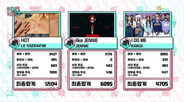 12일 방송된 MBC 가요프로그램 ‘쇼! 음악중심’에서는 르세라핌의 ‘핫’(HOT), 제니의 ‘라이크 제니’(like JENNIE), 키키의 ‘아이 두 미’(I DO ME)가 1위를 놓고 경쟁했다.