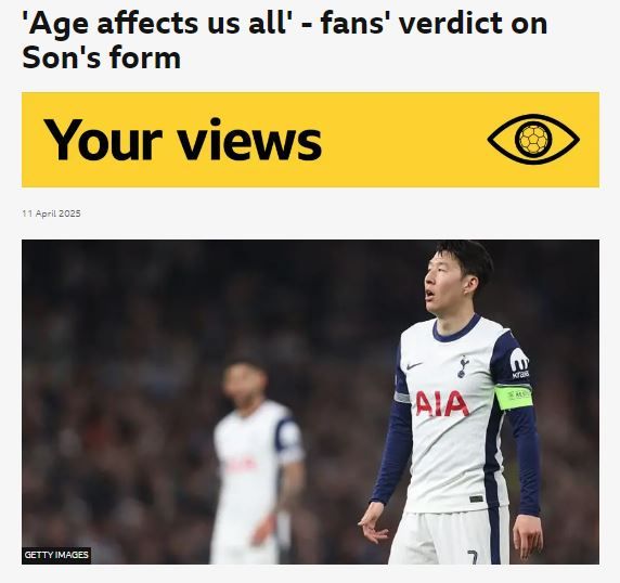 'BBC'는 11일(한국시간) '나이는 누구에게나 영향을 미친다 – 팬들이 본 손흥민의 현재 폼'이라는 제목의 기사에서, 손흥민의 경기력 하락에 대해 팬들이 보인 반응을 집중 조명했다.
