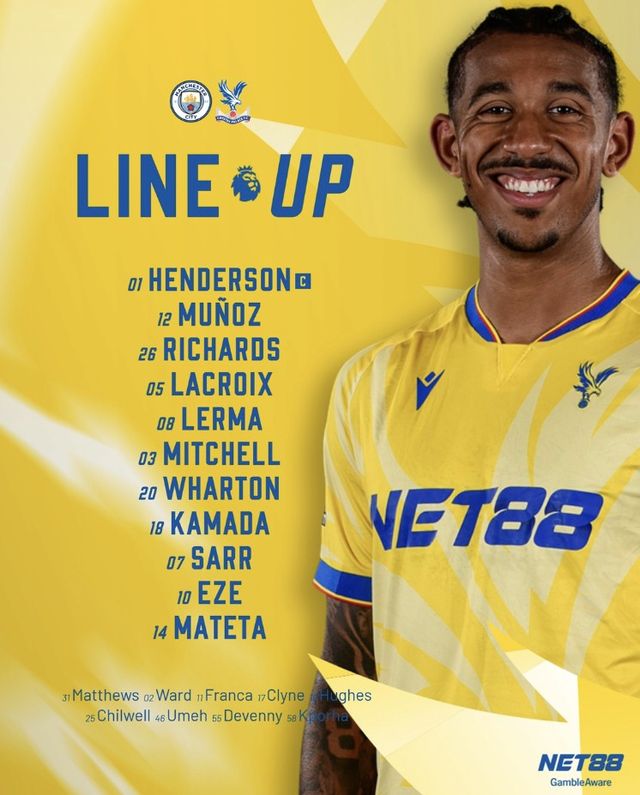 오스트리아 출신 올리버 글라스너 감독이 지휘하는 원정팀 크리스털 팰리스는 3-4-2-1 전략을 준비했다. 딘 핸더슨이 골키퍼 장갑을 착용했다. 수비 라인은 크리스 리처즈, 막상스 라크루아, 헤페르손 레르마로 구성했다. 중원엔 다니엘 무노즈, 애덤 워튼, 가마다 다이치, 타이릭 미첼이 선택됐다. 그 앞에 이스마일라 사르, 에베레치 에제가 위치했고 최전방은 장-필리페 마테타가 이름을 올렸다.