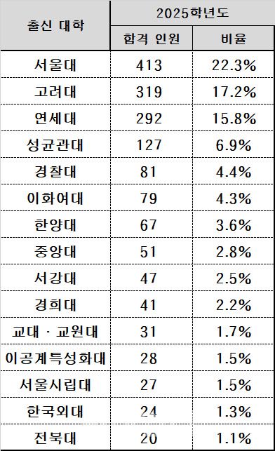 종로학원은 이러한 내용의 ‘2025학년도 로스쿨 합격자 출신 대학 현황’을 13일 공개했다. 전국 25개 로스쿨 중 관련 자료를 공개한 22곳을 대상으로 취합한 결과다.