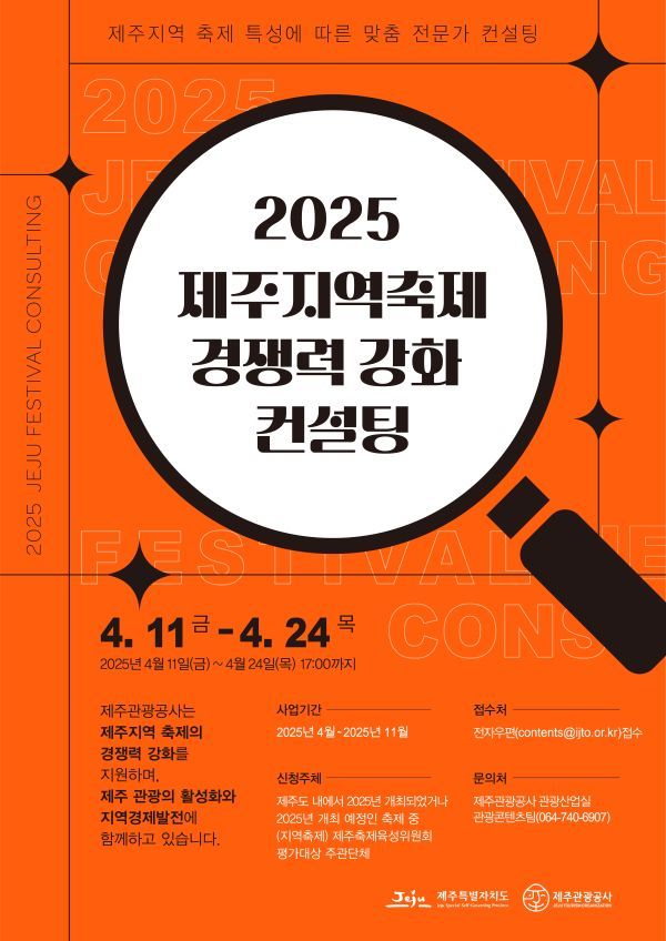 [한라일보] 제주특별자치도와 제주관광공사가 오는 24일까지 '2025년 제주지역 축제 경쟁력 강화 컨설팅 사업'에 참여할 축제를 공개 모집하고 있다.