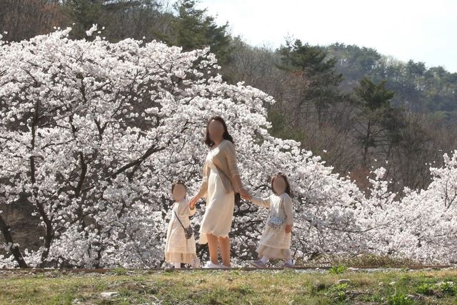 마이산 벚꽃길을 쌍둥이 자녀와 함께 걷는 아이 엄마 / 진안군 제공