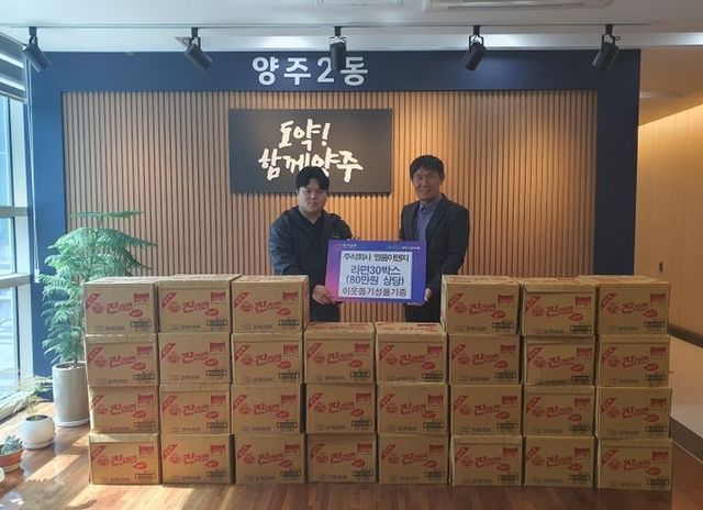 [와이뉴스] 양주시 양주2동이 지난 11일 관내 만송동에 소재한 ㈜명품이앤지에서 어려운 이웃에게 전달해달라며 라면 30박스(환가액 80만 원 상당)를 기부했다고 밝혔다.