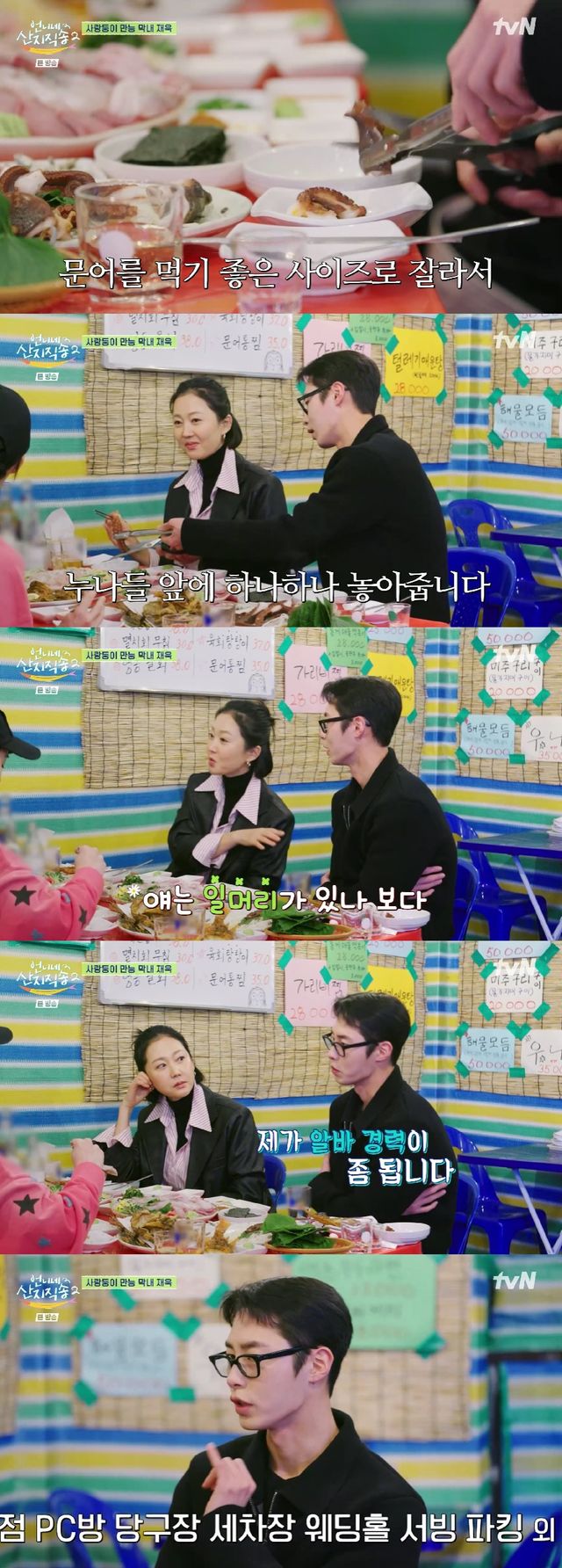 방어가 나오자 이재욱은 쌈을 싸주거나 문어를 먹기 좋은 크기로 잘라 앞접시에 덜어주는 등 막내다운 센스를 발휘했다. 이를 본 염정아는 "얘가 일머리가 있나 보다"고 말했고, 이재욱은 "알바 경력이 있다"고 답했다.
