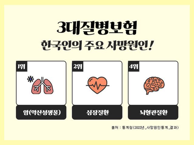 [와이뉴스] 한국인의 주요 사망원인중에 암, 뇌혈관질환, 심혈관질환은 흔히 3대질병이라 일컬어지며 살아가면서 가장 먼저 대비해야 하는 중대질병으로 항상 강조되고 있다. 이들 질병에 미리 대비하기 위해 가입하는 것이 진단비보험인데, 이러한 3대질병진단비를 중점으로 보장하는 보장성보험이 3대진단비보험 이다. 3대질병진단비보험은 각각의 질병에 주목해서 보장하기도 하지만, 나에게 맞는 추가 특약을 잘 골라서 가입한다면 종합건강보험으로도 충분히 활용도가 높다.