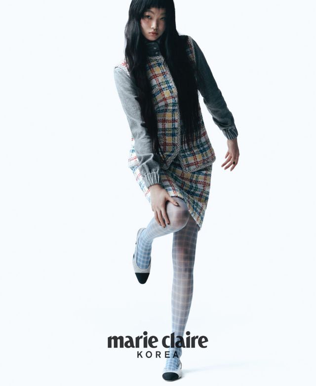 코튼과 트위드 소재를 조합한 재킷과 스커트, 플랫 슬링백 슈즈 모두