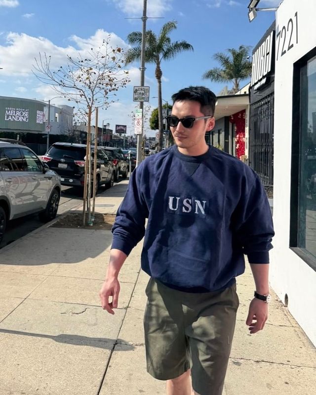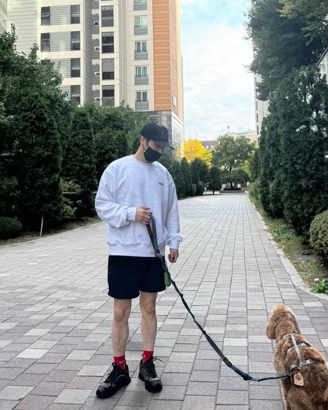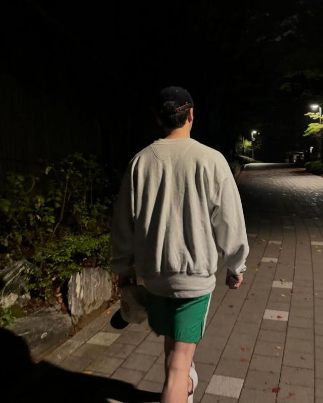 그레이, 네이비 등 깔끔하고 베이직한 스웨트 셔츠에 반바지를 매치하는 걸 즐기는 변요한. 화려한 디자인이 있는 것보다 베이직한 디자인을 선호하며 포인트를 줄 때는 팬츠의 컬러나 양말 컬러 등 색깔로 룩에 포인트를 준다. 신경 쓰지 않은 듯 ‘꾸안꾸’ 느낌을 연출할 때 참고할 만한 스타일링.