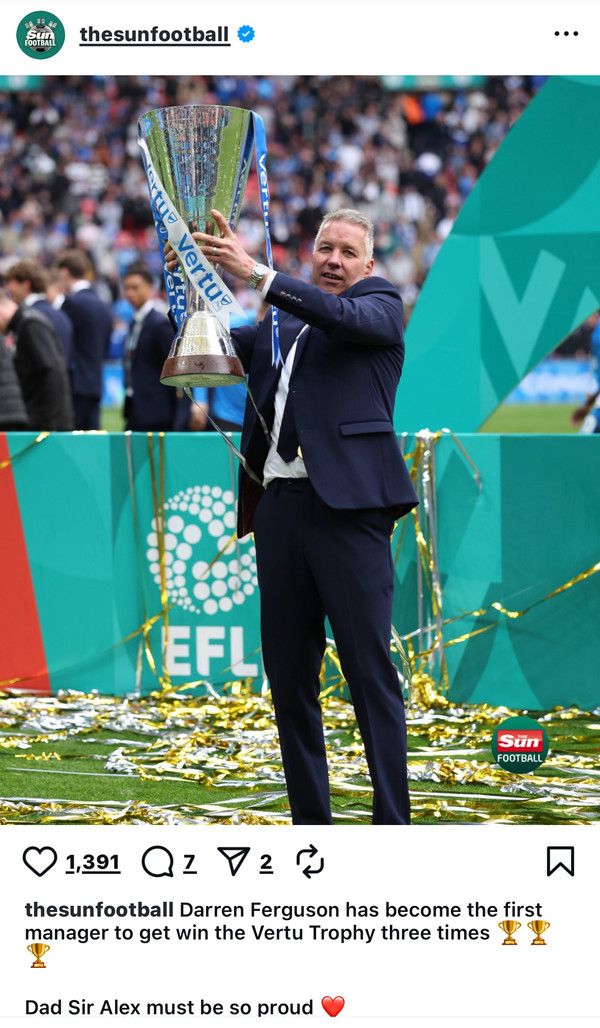 퍼거슨 전 감독의 아들인 대런 퍼거슨 감독이 새로운 역사를 썼다. 자신이 맡고 있는 잉글랜드 리그1(3부리그) 소속의 피터보로 유나이티드를 이끌고 우승컵을 차지했다.
