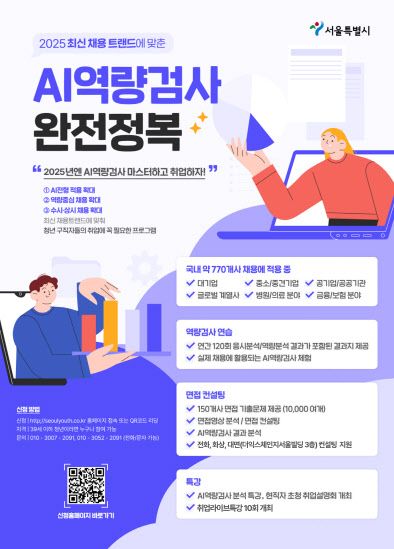 시는 먼저 청년들이 급변하는 취업 트렌드에 발맞춰 비대면 AI 채용에 대비할 수 있도록 AI 면접체험(성향검사, 영상면접, 전략게임)과 역량 검사 프로그램을 제공한다. 올해는 1인당 월간 이용 가능한 수검 횟수를 지난해보다 2배 늘려 월 최대 10회까지 늘렸다.