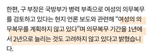 여성 군복무 의무화 검토를 한다고 알려졌으나,