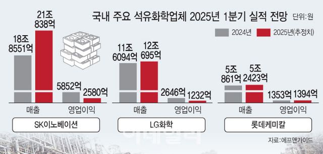 롯데케미칼 사정도 크게 다르지 않다. 본업인 석화 경쟁력 약화에다 뒤늦게 진출한 배터리 소재 사업에서도 고전을 면치 못하는 중이다. 에프앤가이드에 따르면 롯데케미칼은 올 1분기 1394억원의 영업손실을 낼 것으로 전망된다. 석유화학 공급과잉 여파로 수익구조가 악화한 데다, 전기차 전방 수요 감소로 배터리 소재 자회사 롯데에너지머티리얼즈 역시 흑자 전환까지 다소 시일이 걸릴 것으로 예상되고 있다.