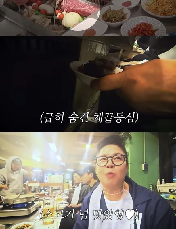 먹는 내내 전현무가 언제 오는지 눈치를 살피던 이영자와 송은이는 급히 채끝 등심을 테이블 아래로 숨기는 모습을 보였다.