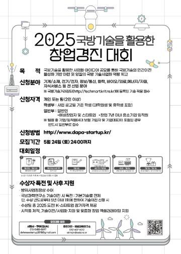 [와이뉴스] 방위사업청은 국방기술의 민간 이전 활성화를 통한 창업지원과 청년 일자리 창출을 위해 개최 예정인'2025 국방기술을 활용한 창업경진 대회'의 참가자를 5월 24일까지 공개모집 한다고 밝혔다.