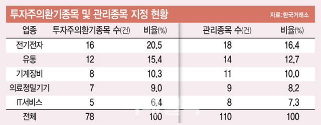 올해 새로 지정된 종목 중에서도 전기·전자 업종의 비중이 가장 높았다. 신규 지정 종목 중에서도 전기·전자 업종은 전체 투자주의환기종목의 18.8%, 관리종목의 15.2%를 차지했다.
