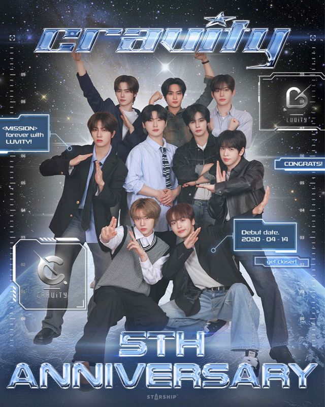 소속사 스타쉽엔터테인먼트는 오늘(14일) 크래비티의 공식 채널을 통해 데뷔 5주년 기념 축전 이미지를 공개했다. 사진 속에는 하나의 행성을 지키는 듯한 크래비티 멤버들과 함께 ‘러비티(공식 팬클럽명)와 영원히 함께하기(forever with LUVITY!)’라는 미션이 적혀있어 크래비티의 세계관과 5주년의 의미를 더했다.
