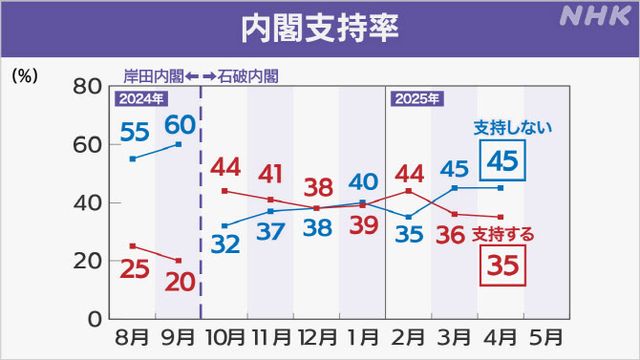 NHK가 같은 기간 18세 이상 1120명을 대상으로 실시한 여론조사에서도 이시바 내각 지지율은 전달 대비 1%포인트 하락한 35%였다. 이는 지난해 10월 내각 출범 후 최저치다. ‘지지하지 않는다’는 견해는 전달과 같은 45%였다.