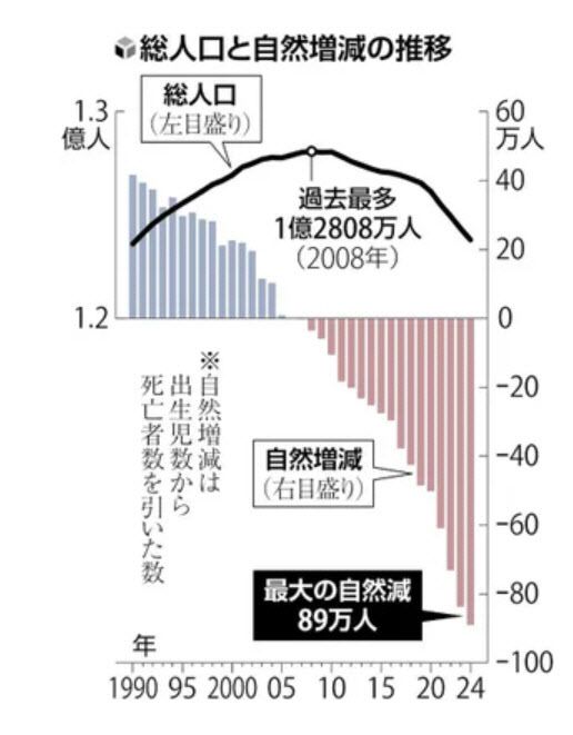 2024년 출생아 수는 71만7000명으로 전년대비 4만1000명 감소했다. 반면 사망자수는 160만7000명으로 1만2000명이 증가했다. 남녀별로는 남성은 45만3000명 감소했고, 여성은 43만7000명이 줄었다. 남성은 20년 연속, 여성은 16년 연속 자연감소가 이어졌다.