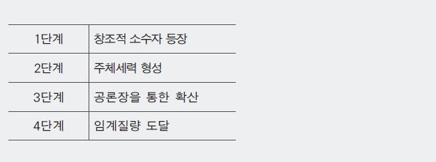 한 사회가 변화하려면 창조적 소수자가 시대를 관통하는 비전을 제시하고 그 비전을 구체적으로 조직화할 주체세력을 형성할 수 있어야 한다. 그리고 주체세력, 즉 유능한 참모진이나 협력자들이 현실에 뿌리내리도록 부단히 노력하며 때로는 적극적으로 세를 형성해서 밀어붙여야 한다. 이러한 작은 노력 하나하나가 조금씩 모이기 시작해 작은 물꼬가 되고 이어 큰 물줄기가 된다. 그렇게 축적되어 임계질량에 도달하면 변화가 일어나는 것이다. 여기서 한 가지라도 부족하면 변화는 일어나지 않는다.