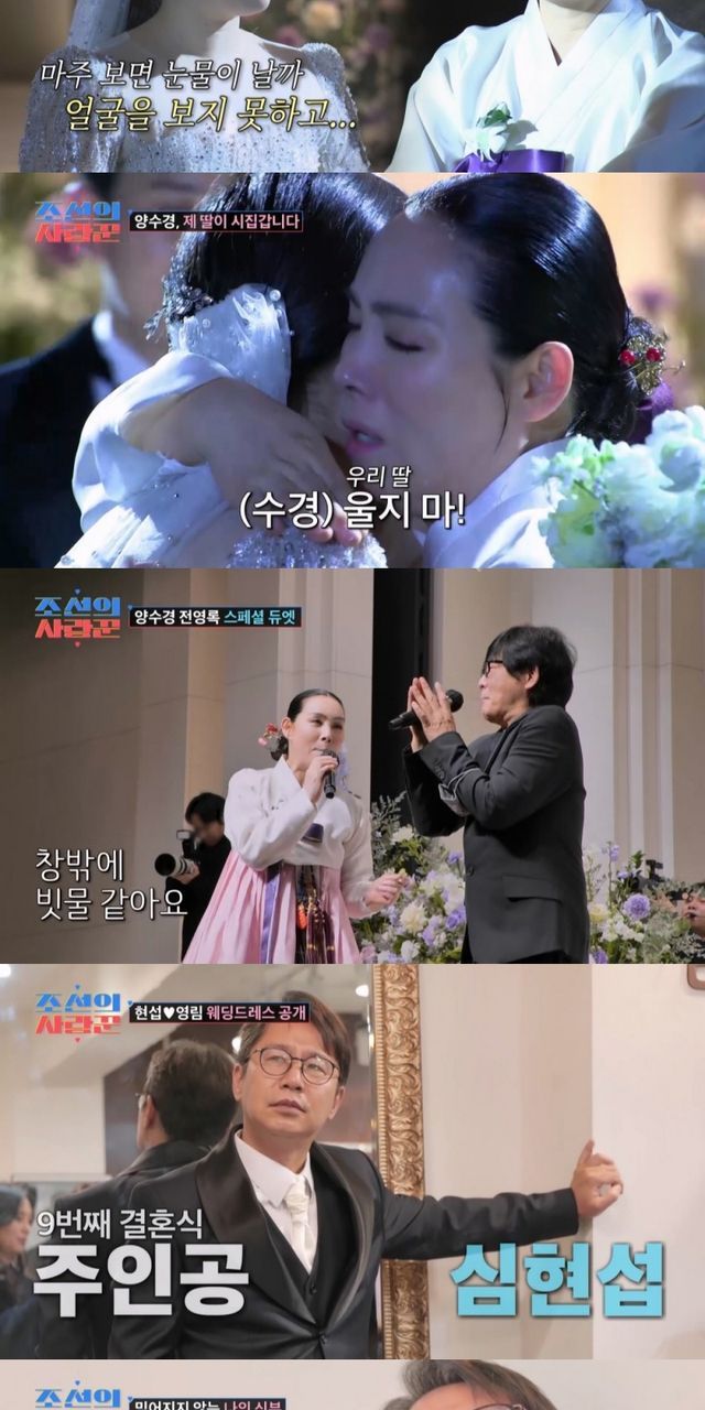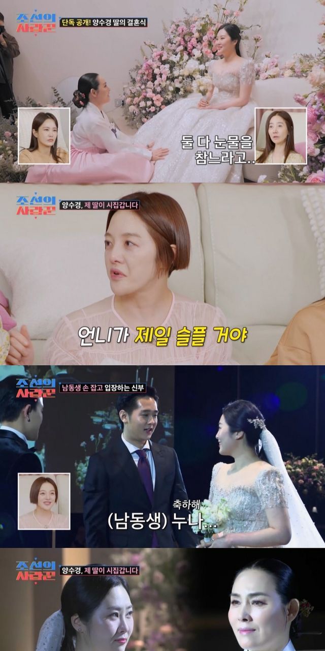 신부 대기실에서 딸의 웨딩드레스 입은 모습을 마주한 양수경은 "울지 말자, 서로 코만 보자"며 눈물을 참았다. 하지만 시선을 마주치지 않는 노력(?)에도 눈시울이 붉어졌다. 이를 지켜본 '딸 맘' 강수지는 "(나중에) 신부 대기실에 들어가지 말아야겠다"며 과몰입해 웃음을 자아냈다.