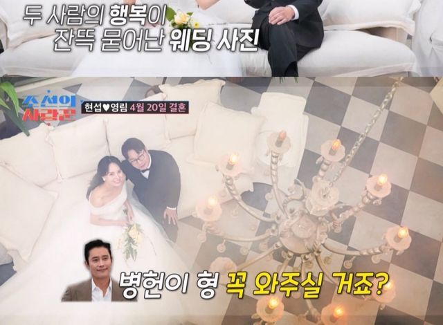 이후 심현섭의 예복도 공개됐다. 심현섭은 "내가 800쌍 넘게 사회 보면서 신랑 옷을 많이 봤지 않냐. 클래식한 게 제일 낫더라"라며 단번에 턱시도를 골랐다. 영상의 말미에는 두 사람의 웨딩 화보도 공개됐다. 심현섭은 "저 드디어 장가간다. 병헌이 형, 와 주실 거냐"라며 마지막까지 '고등학교 1년 선배'인 이병헌 섭외를 멈추지 않아 폭소를 자아냈다.