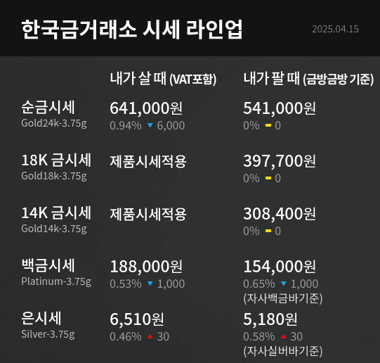 [투어코리아=김민석 기자] 한국금거래소 4월 15일 기준 24K 금시세는 내가 살 때 기준 3.75g당 641,000원으로 전일 대비 6,000원(-0.94 %) 하락했다.