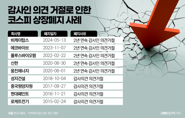 코스피 시장에서 선박투자업·리츠·펀드 등을 제외한 일반 기업의 감사인 의견 거절로 인한 상장폐지 사례는 흔하지 않다. 2015년부터 10년간 의견거절을 사유로 코스피에서 퇴출당한 기업은 9곳에 불과하다. 특히 2018년 이후부터는 의견거절로 상장폐지 사유 발생 후 심의에서 개선기간이 부여된 사례가 늘어났다. 2020년 6월 상장폐지된 웅진에너지의 경우 2018년, 2019년 각 사업보고서에 대해 의견거절을 받아 증시에서 퇴출됐다. 2020년 신한, 2022년 폴루스바이오팜, 2023년 에코바이브, 2024년 비케이탑스가 개선기간을 부여받고도 2년 연속 의견거절로 상장폐지됐다.